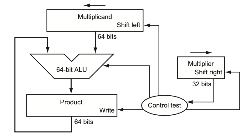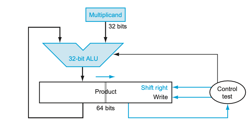 The Multiplicand register, ALU, and Multiplier register are all 32 bits wide, with only the Product register left at 64 bits. Now the product is shifted right.